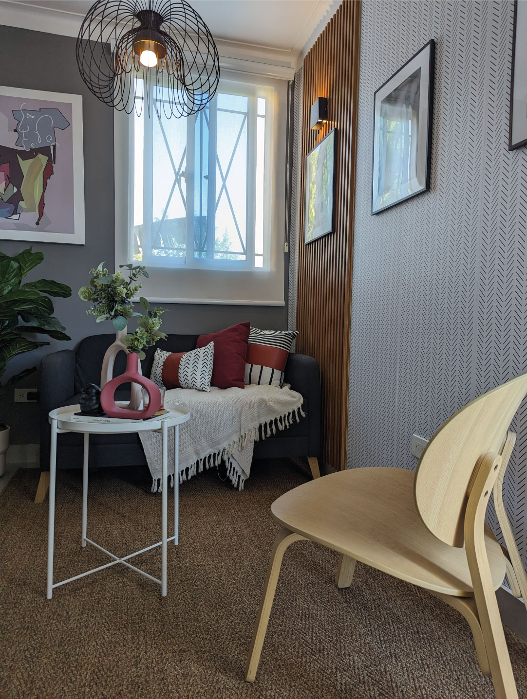 Por esto el uso del negro, blanco y gris para los elementos más fuertes y como pop of color(estallido de color) utilizamos una obra de Mario José Ángeles que nos permitió tener un statement piece(pieza imponente) y a partir de ahí colocar elementos con colores acorde a este, logrando así un contraste pero manteniendo la armonía del espacio.